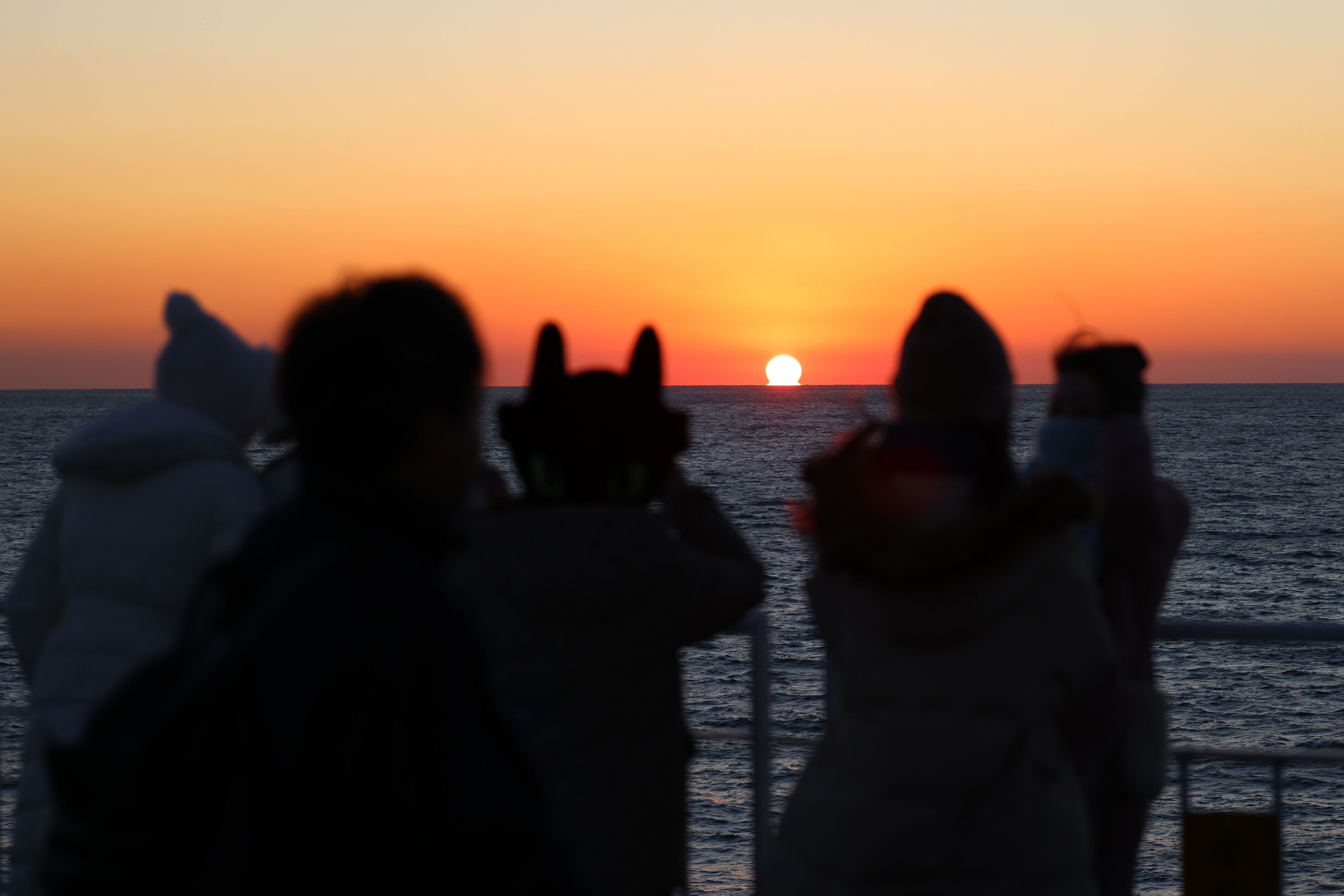 确实如此,活动中,不少游客表达了他们对海上日落的期待和看到后的惊喜。当太阳慢慢西落,西面的天空变成橙黄色,波光粼粼的大海也被晕染成了“橘子海”,看着红彤彤的太阳,一点点藏于海平面,光影之间,美得不可胜收……尽管甲板上风浪较大,但阻挡不了大家对海上日落的热情,纷纷拿起手机记录这唯美时刻。