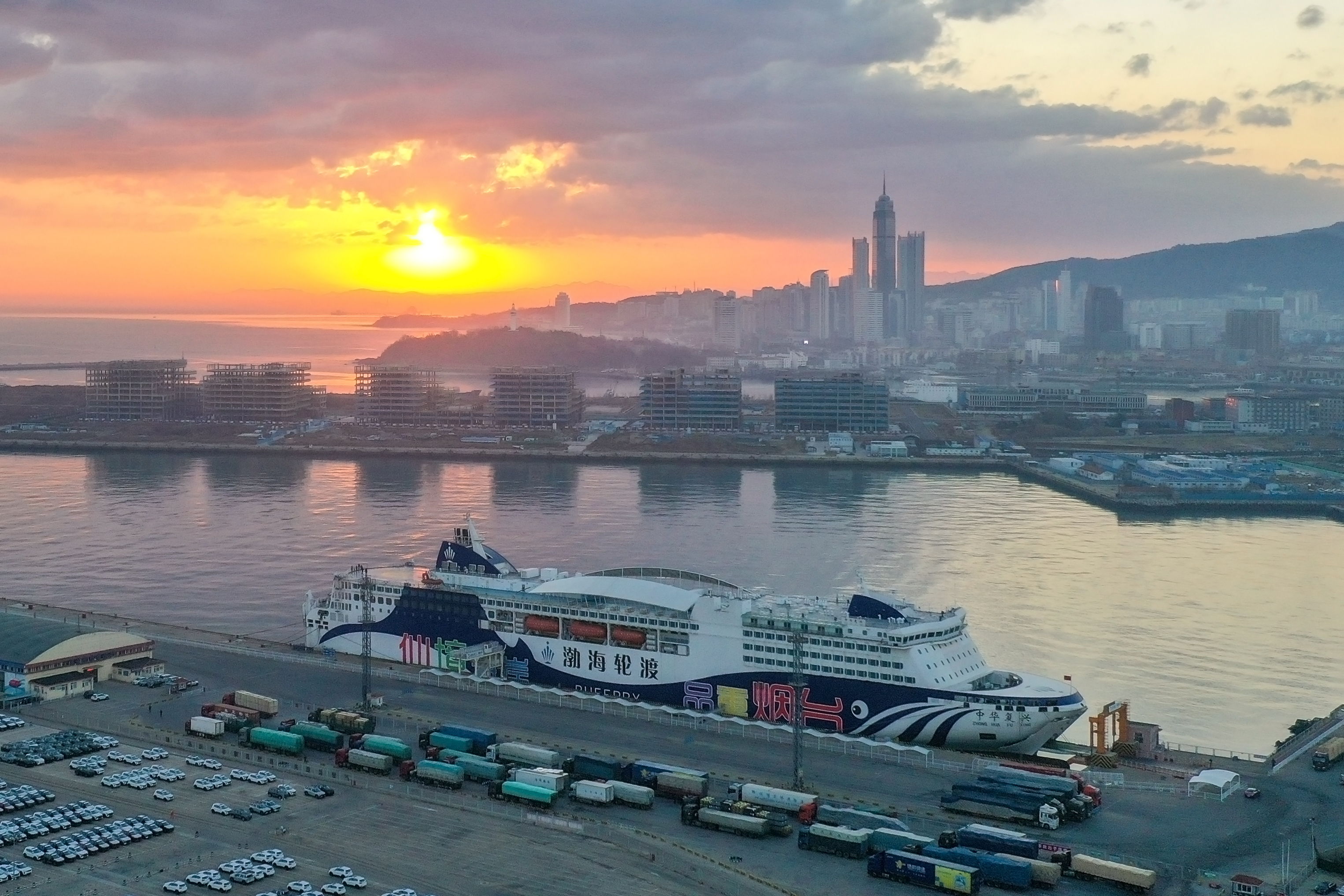 12月5日,中华复兴轮停泊在烟台港内,朝阳冉冉升起。