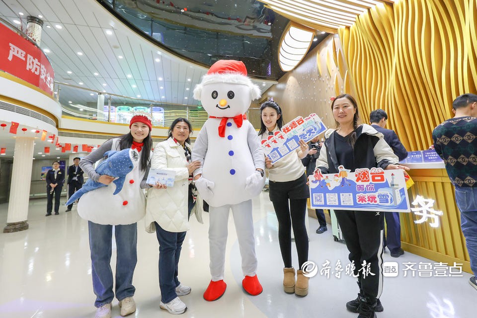除了精彩的海上宠粉行动,工作人员们还走进大连湾综合交通枢纽港,为大连市民和全国各地的游客送上来自烟台的热情,发放烟台文旅资源导览。在宠粉行动中,我的老搭档烟台“大雪人”也来到了现场,与旅客朋友进行了精彩互动,为大家带来了“烟台雪窝”的精致小礼品,并邀请大连老乡携亲朋好友“常回家看看”。