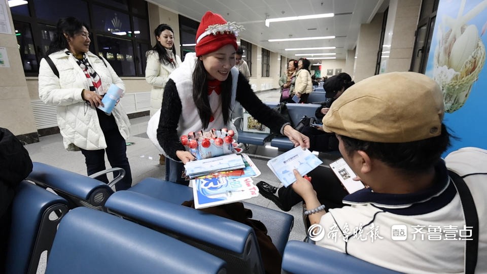 工作人员在大连港大连湾客运站候船厅内为旅客送上烟台文旅纪念品。