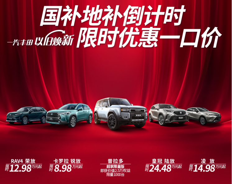 近日,一汽丰田推出了针对12月的限时优惠购车政策,旨在全力冲刺80万辆的年度销售目标。此次优惠涵盖了多款车型,包括卡罗拉1.2T、卡罗拉锐放、RAV4荣放、皇冠陆放、凌放、格瑞维亚以及亚洲龙2.0L等,均提供限时一口价优惠。