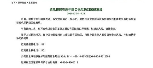 随着战火蔓延,12月5日,中国驻叙利亚大使馆迅速反应,紧急发布提醒,建议在叙中国公民尽快回国或离境。据央视新闻消息,当日在叙利亚首都大马士革传出连续枪炮声,并且叙利亚政府军发表声明称击落两架无人机。