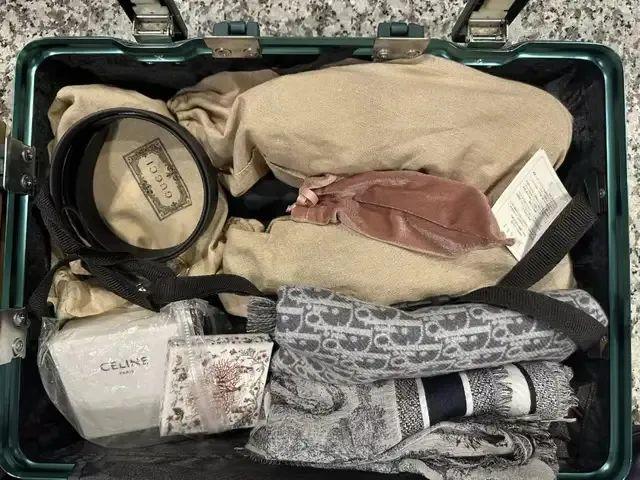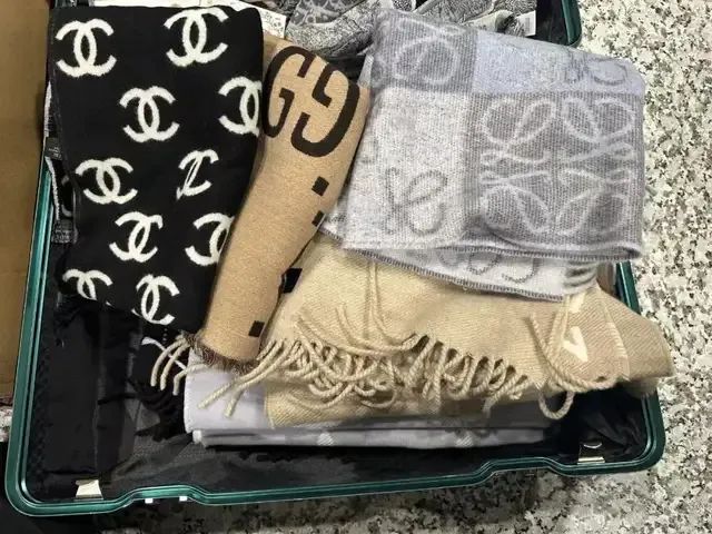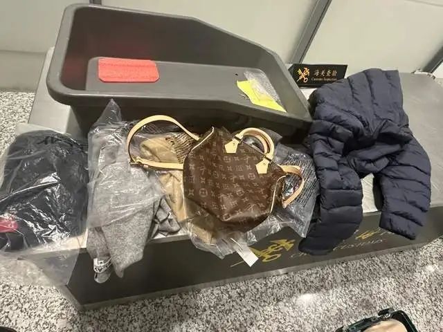 查获的超量携带入境的奢侈品包、围巾和衣物