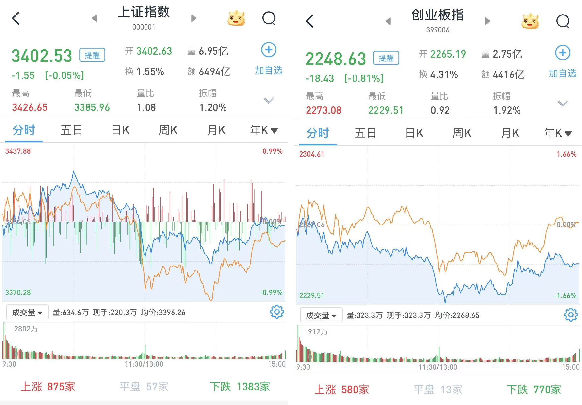至收盘,上证综指跌0.05%,报3402.53点;科创50指数跌1.09%,报1003.38点;深证成指跌0.55%,报10731.66点;创业板指跌0.81%,报2248.63点。