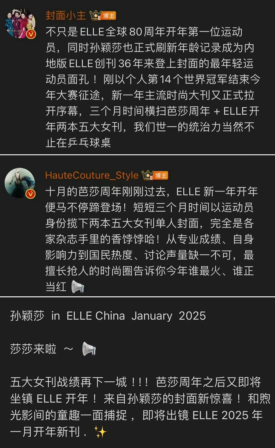 12月9日,著名时尚杂志《ELLE》官方宣布,乒乓球奥运冠军孙颖莎将在2025年的开年刊封面上亮相!
