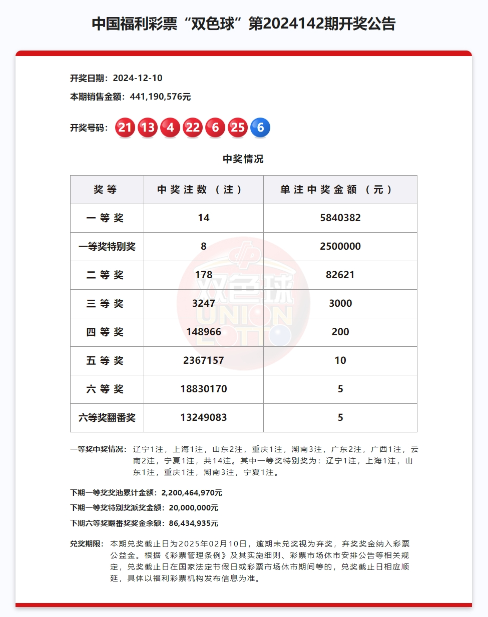 双色球2024142期中出一等奖14注筹集公益金1.58亿元 大众报业·齐鲁壹点 2024-12-11 4634 双色球开奖 第2024142期 12月10日 开奖号码 一等奖 辽宁(1注)上海(1注)山东(2注)重庆(1注)湖南(3注)广东(2注)广西(1注)云南(2注)宁夏(1注) 奖池金额22.00亿元 本期销量 4.41亿元 筹集公益金 1.58亿元 (点击图片可放大查看) 量力而行 理性购彩 (来源:“中国福彩”微信公众号) 责任编辑:姜素坤