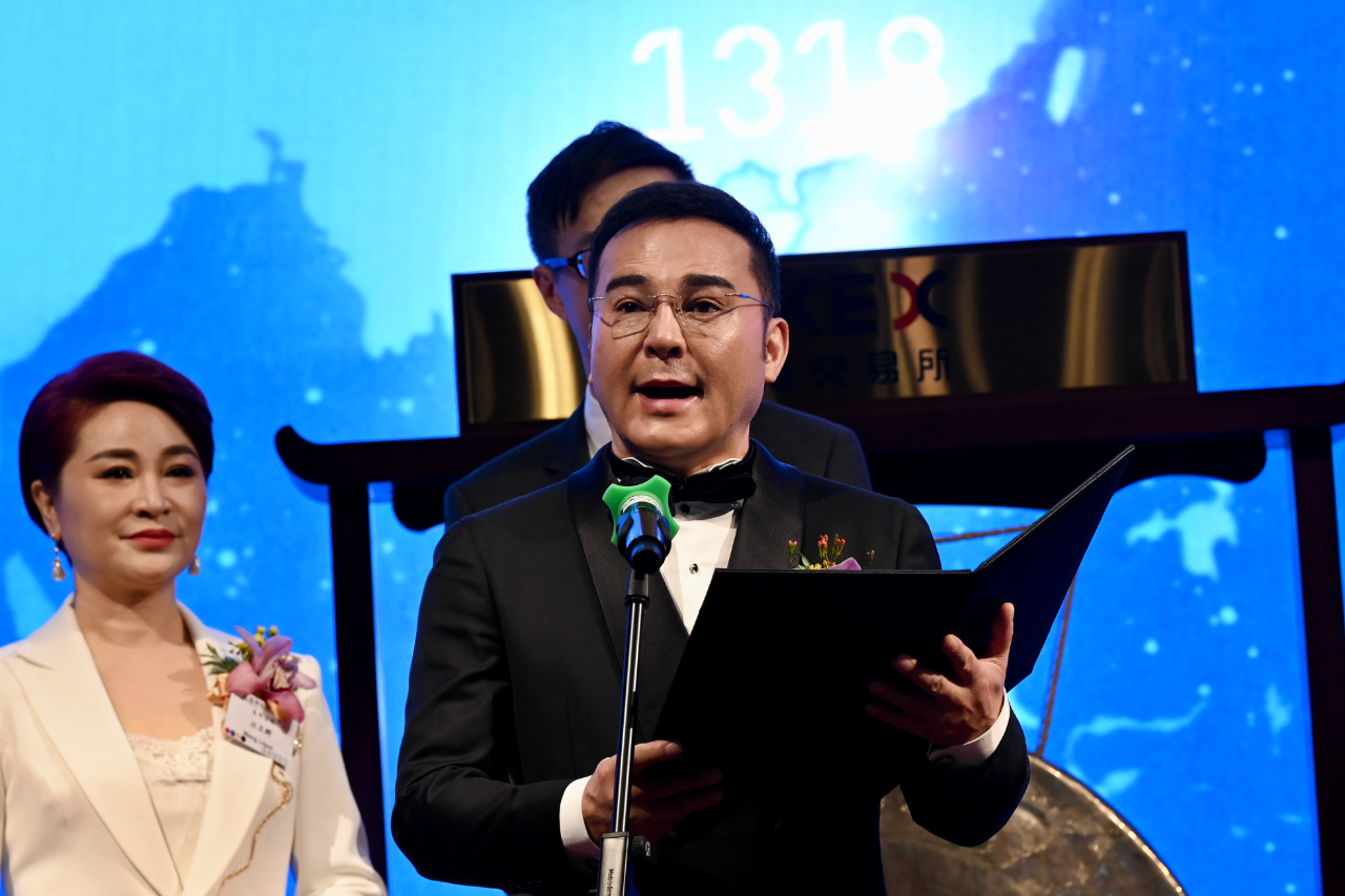 12月10日上午,毛戈平化妆品股份有限公司在香港交易及结算所有限公司(香港交易所)上市。图为该公司创始人、董事长兼执行董事毛戈平出席上市仪式并致辞。(图片由CNSPHOTO提供)