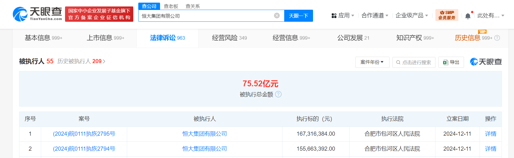 恒大集团等被恢复执行3.2亿 天眼查 2024-12-13 3936 天眼查法律诉讼信息显示,12月11日,恒大集团有限公司新增2条恢复执行信息,执行金额合计3.22亿余元,涉及建设工程合同纠纷案件,被执行人还包括合肥粤泰商业运营管理有限公司、恒大地产集团有限公司等,执行法院为合肥市包河区人民法院。 天眼风险信息显示,恒大集团有限公司现存50余条被执行人信息,被执行总金额超75亿元。此外,该公司还存在多条限制消费令、失信被执行人(老赖)和终本案件信息。 (天眼查) 责任编辑:季明智