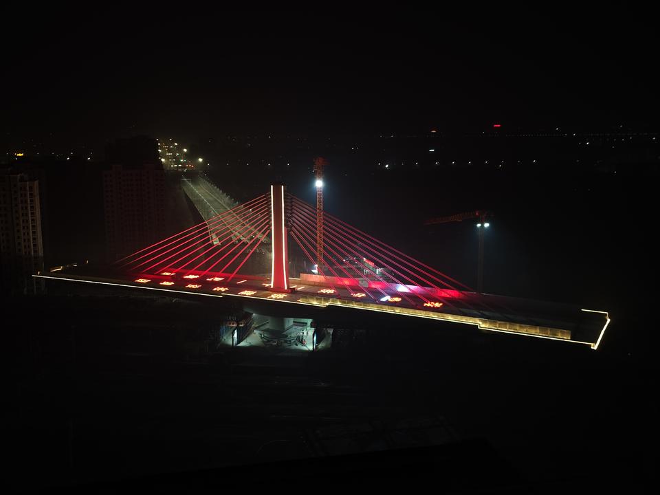 此外,项目建设过程中,“数智化”技术贯穿全施工周期,项目团队先后攻克了桥梁结构复杂、邻近既有铁路安全风险高、梁体及索塔线形监控难度大、大体积混凝土浇筑、较硬岩地质深基坑等一系列技术难题。自主研发的云端智慧化在线检测系统,实现整个施工周期动态、可视、实时、全面的安全风险预警,保证了施工安全;斜拉索施工改变了以往整体张拉、后期调索的施工方法,设计采用单根张拉施工,一次张拉至设计索力值,后期不再调索,实现了精确的线型和应力控制,提高了施工效率。