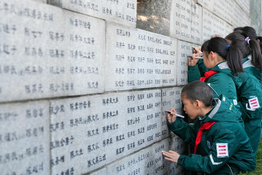 Students use black pens to renew the names on the "wailing wall" outside the Memorial Hall of the Victims in Nanjing Massacre by Japanese Invaders in Nanjing, east China's Jiangsu Province, Dec. 1, 2024. (Xinhua/Li Bo)