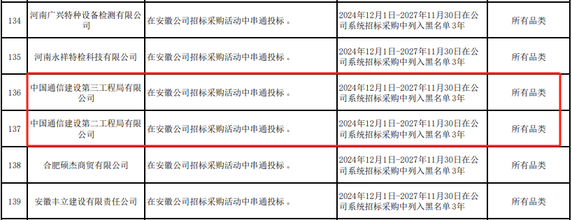 国家电网公告的中国通建二局、中国通建三局不良行为描述均为”在安徽公司招标采购活动中串通投标“。处理措施均为:2024年12月1日-2027年11月30日在公司系统招标采购中列入黑名单3年。处理范围均为:所有品类。