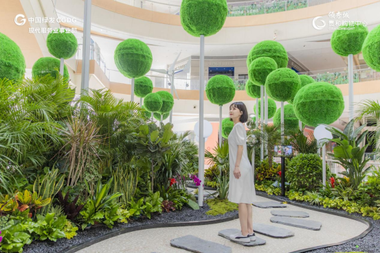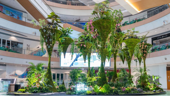 在绿色消费场景方面,领秀城贵和购物中心致力于打造与自然和谐共生的购物环境。通过场内外自然元素的联动与空间生态的重组,购物中心为消费者塑造了一个仿佛游离于城市喧嚣之上的自然绿洲。从2021年的“望岳·谧空之境”悬浮森林主题场景,到2022年的“万物生长·自然回响”绿色生态主题展,每一次的主题打造都力求让消费者在购物的同时,也能享受到身临其境的自然感官体验。