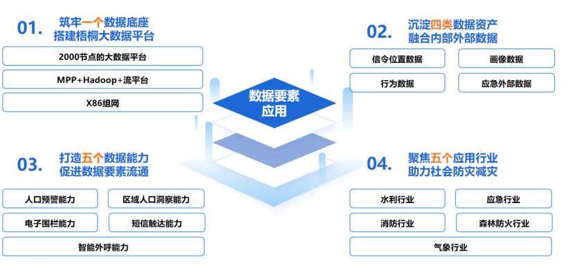 近年来,山东移动贯彻落实国家数据局、山东省大数据局的要求,通过建设一个平台、融合四类数据、打造五个能力、赋能五个行业的“1+4+5+5”工作思路,充分发挥数据要素价值。山东移动梧桐大数据已建设规模超2000节点的大数据平台,搭建了企业级数据中心,融合移动用户位置、画像、行为等内部数据和应急、气象、地震等行业外部数据,沉淀四类数据资产。打造了人口预警、区域人口洞察、电子围栏、短信触达和智能外呼等五大数据创新应用能力,实现融合数据对外赋能。针对水利、应急、消防、森林防火、气象五大行业精准适配现有大数据能力,提供更加科学的防灾减灾指导。