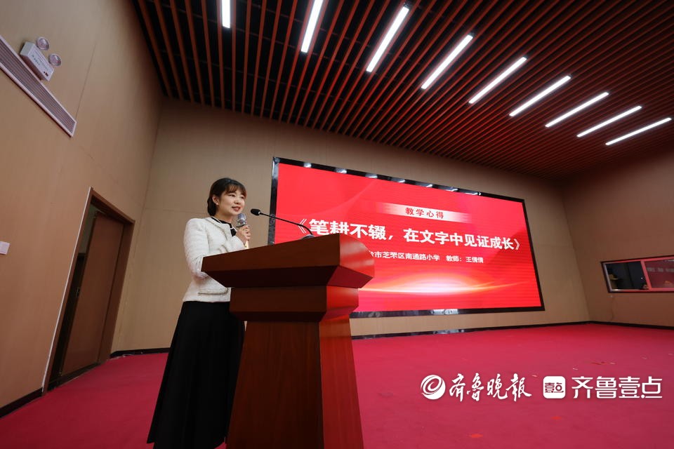 在分享环节,一等奖获得者、芝罘区只楚小学的褚一诺同学朗诵了获奖作品《我与祖国共成长》,其真挚的情感与动人的笔触打动了在场每一个人。优秀指导教师、芝罘区南通路小学教师王倩倩分享了教学心得,赢得了现场阵阵掌声。