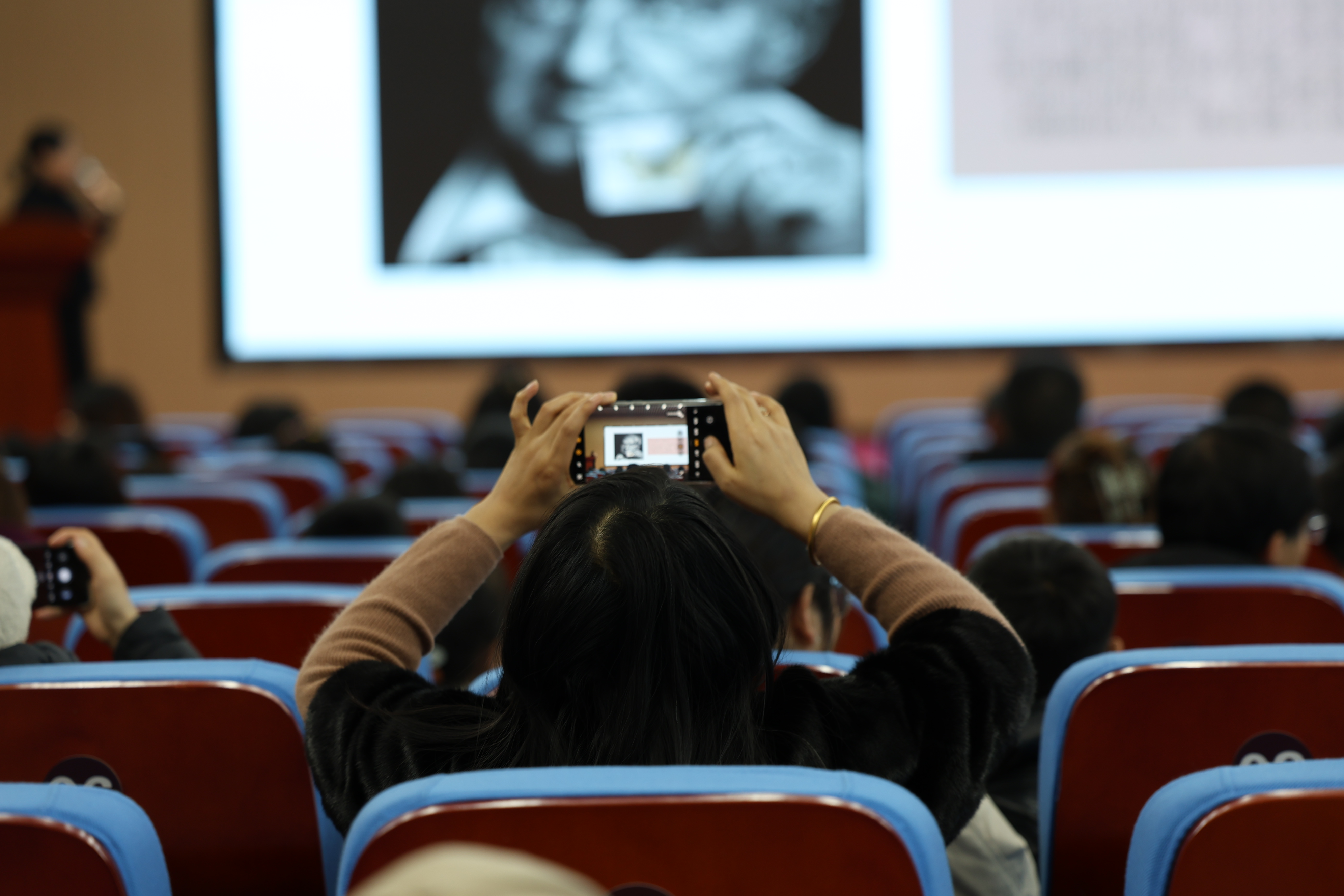 台下听众认真听王秀梅讲课,用手机记录精彩内容。(吕奇 摄)