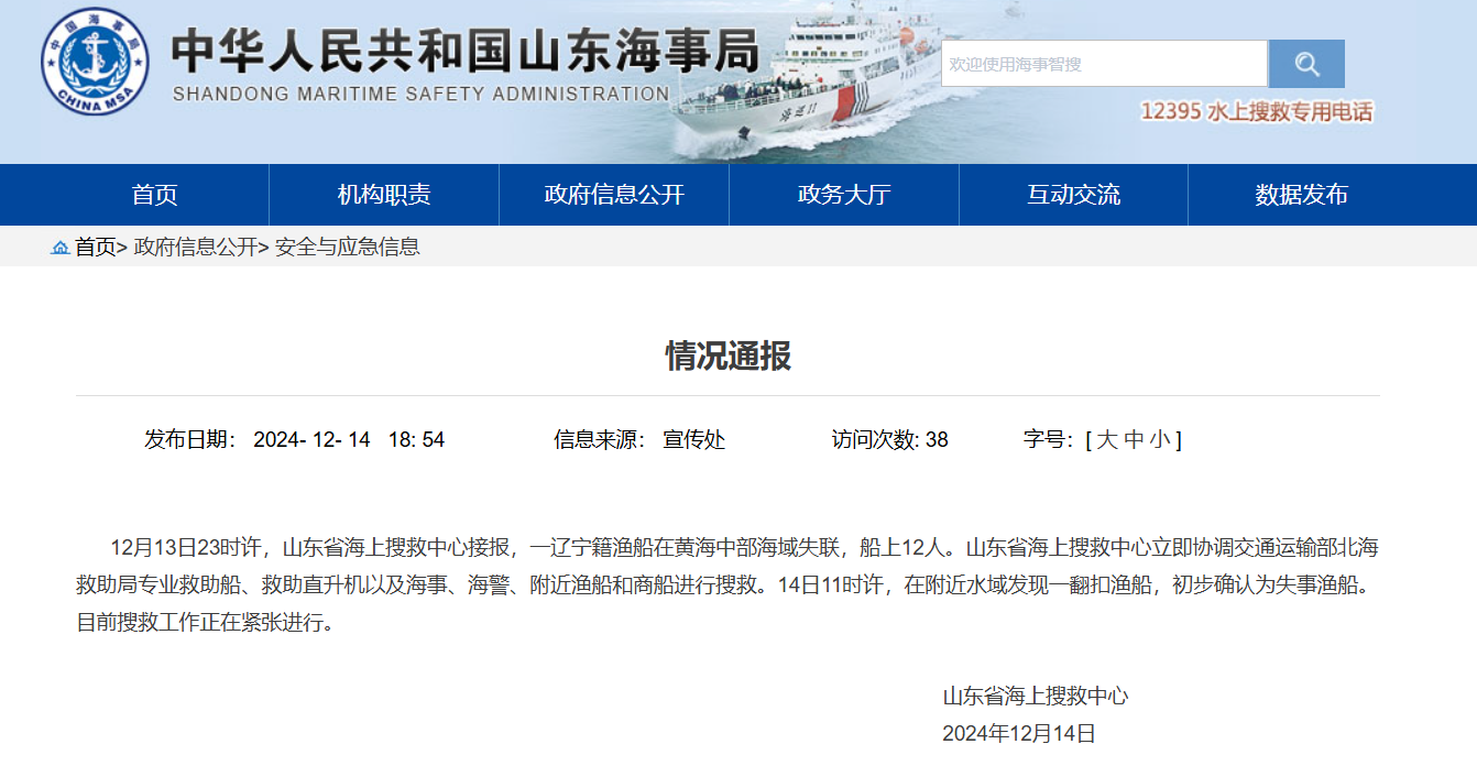 山东省海上搜救中心发布通报,12月13日23时许,山东省海上搜救中心接报,一辽宁籍渔船在黄海中部海域失联,船上12人。山东省海上搜救中心立即协调交通运输部北海救助局专业救助船、救助直升机以及海事、海警、附近渔船和商船进行搜救。14日11时许,在附近水域发现一翻扣渔船,初步确认为失事渔船。目前搜救工作正在进行。