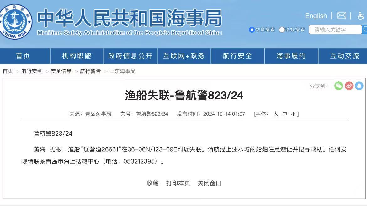 此前,青岛海事局发布消息,一渔船“辽营渔26661”在36-06N/123-09E附近失联。请航经上述水域的船舶注意避让并搜寻救助。