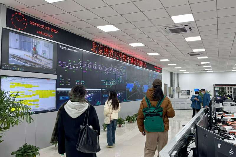 在车辆段智能管控系统的大屏前,北京地铁运营四分公司3号线、12号线运营事业部工程项目管理中心综合调控员温泉向中青报·中青网记者介绍,该系统是以车辆检修为概念基础,以生产安全、运营数据、状态监测为发展方向,融合信号系统、车辆网络系统、设备物联网等数据,形成一个数实结合的管控系统。