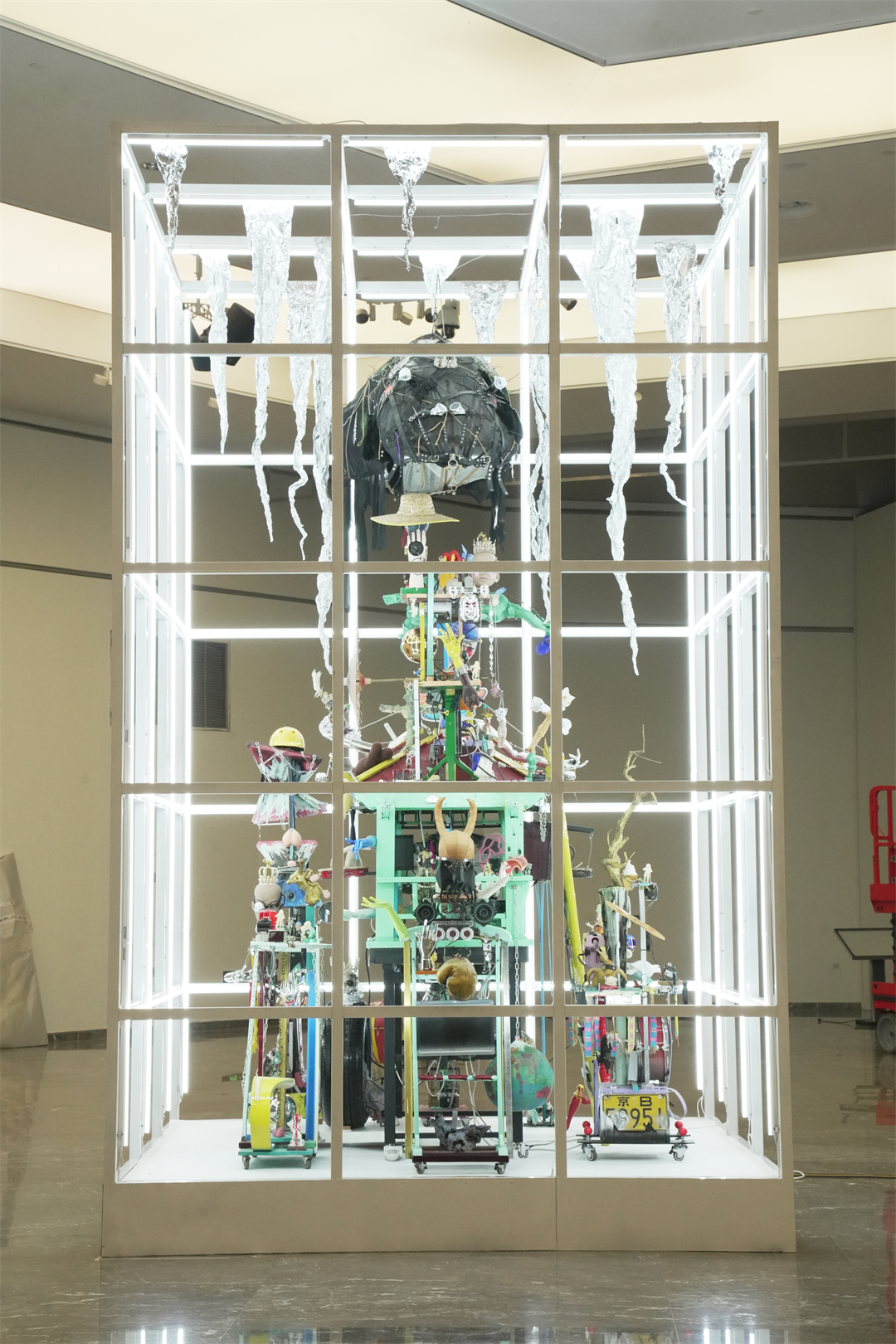该件展品位于济南市美术馆“土地与时间”板块,在展览大厅非常显眼的位置。映入观众眼帘的是一个类似于“晶立方”的装置,外形呈长方体。四周用方形钢管焊接保护,接电后闪闪发光。其内部结构比较“怪异”,一架“架子车”上,装有各种能旋转、运动、敲打发出响声的零部件,细看,其中有拳击手套、头盔、纸伞、旗帜、铁链、信号灯、唐三彩、鼓、毛笔……看似毫无关系的一堆器物被“架子车”连在一起,每当观众靠近,“架子车”驱动起来,浑身零部件同时活动,并发出各种声响。