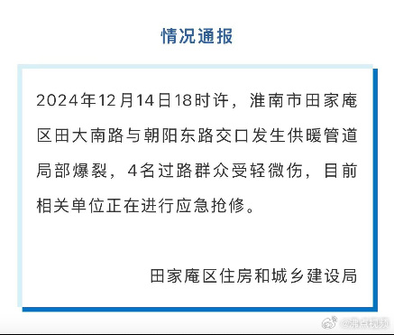 12月14日晚,淮南市田家庵区住建局发布情况通报称,14日18时许,田家庵区田大南路与朝阳东路交口发生供暖管道局部爆裂,4名过路群众受轻微伤,目前相关单位正在进行应急抢修。