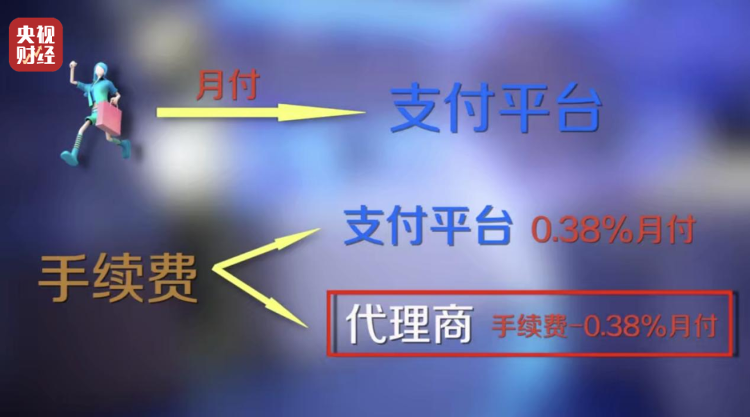 工作人员向记者介绍,代理可以给从自己这里接入“先享后付”的商家规定手续费,一般在3%到6%之间。消费者扫了店铺“先享后付”的二维码进行分期扣费,这笔金额从消费者账户流出,支付平台扣除代理和商家谈好的手续费,再从手续费里扣除0.38%作为平台的结算费用后打给代理,代理就赚到了流水分润,手续费以外的部分打给商家。