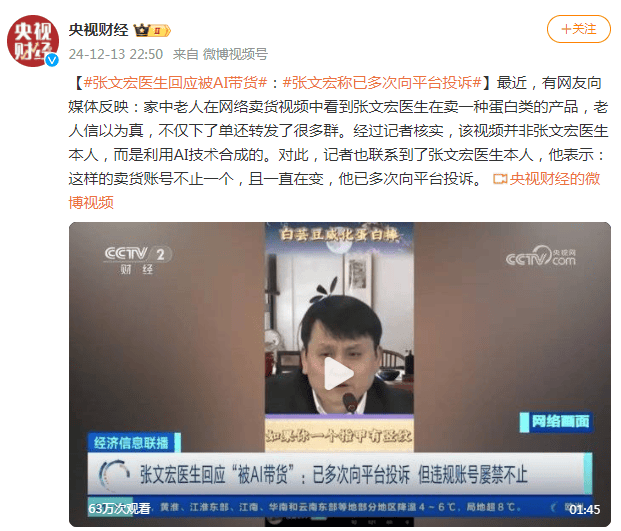 对此,张文宏医生表示, “这样的卖货账号不止一个,且一直在变,我多次向平台投诉但屡禁不绝。很多不明真相的老百姓、特别是有些对AI不是很熟悉的、年纪较大的市民,就很容易相信。”