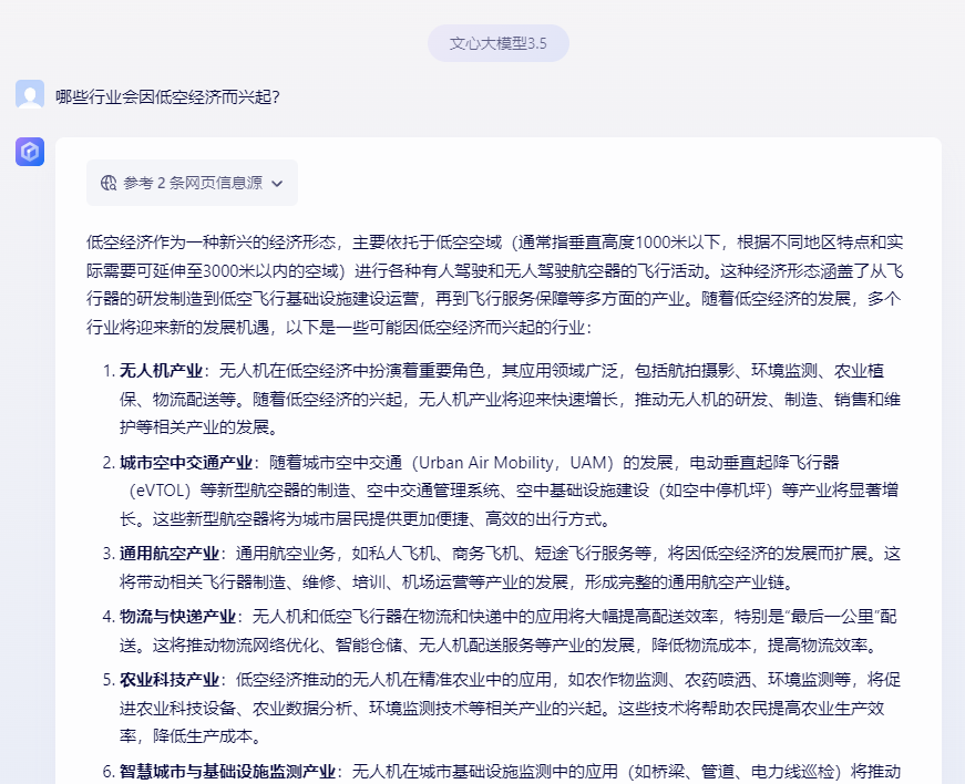 文心一言回答的行业包括无人机产业、城市空中交通产业、通用航空产业、物流与快递产业、农业科技产业、智慧城市与基础设施监测产业、应急救援产业、旅游与娱乐产业、通信与导航产业、法律与监管服务产业等。