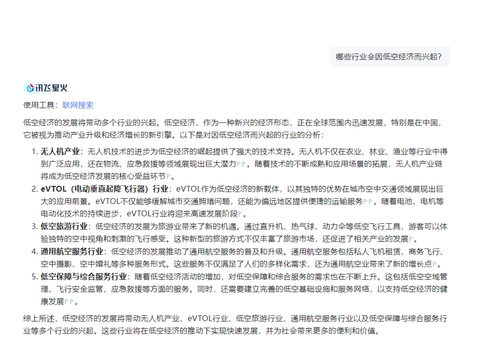 讯飞星火回答的行业包括无人机产业、eVTOL(电动垂直起降飞行器)行业、低空旅游行业、通用航空服务行业、低空保障与综合服务行业等。