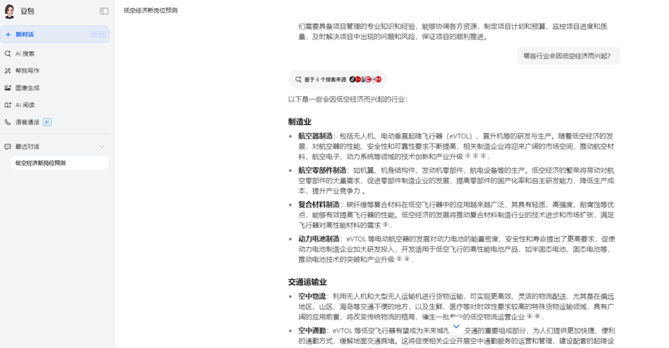 豆包回答的行业包括制造业下分航空器制造、航空零部件制造、复合材料制造、动力电池制造,交通运输业下分空中物流、空中通勤、旅游客运,服务业下分飞行培训、维修保养、空域管理与运营服务、保险服务,农业下分农业植保和农业检测,应急救援下分医疗救援和消防灭火,测绘与地理信息下分地形测绘和自然资源监管。