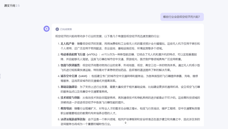 通义千问回答的行业包括无人机产业、电动垂直起降飞行器(eVTOL)、物流与快递服务、城市空中交通(UAM)、基础设施建设、技术研发与创新、教育培训、法律法规及政策咨询、保险服务等。