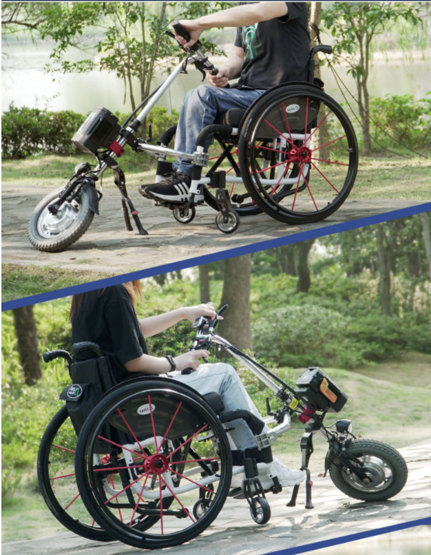 让电动自行车加足马力都追不上的轮椅车,其实加装了“牵引轮椅车头”。