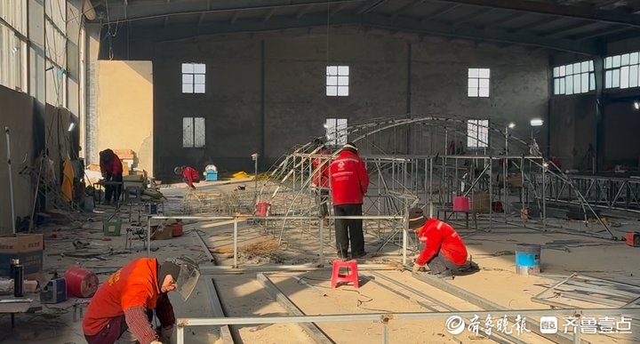12月17日,在第44届趵突泉迎春花灯会灯组制作现场,放眼望去,整个场地焊枪火花四溅,彩灯工匠紧锣密鼓地施工。不远处,铁丝、色丁布、丙烯颜料等材料整齐地摆放着,等待着工匠们的巧手雕琢。
