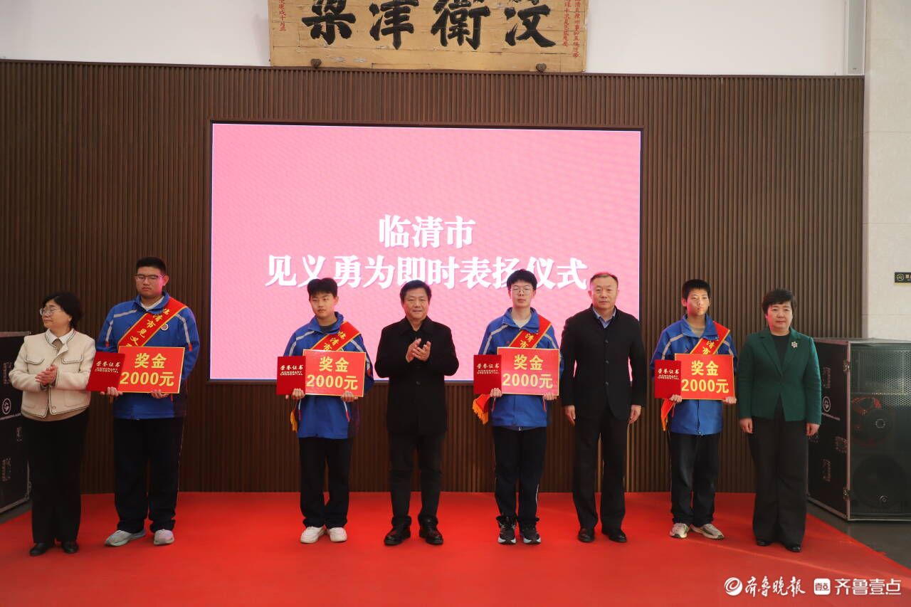 仪式上,临清市委政法委分管日常工作的副书记张继香宣读了中共临清市委政法委、市见义勇为协会《关于授予曹东硕等同学临清市见义勇为模范的决定》。李明艳、王兴刚、王钰、姚晨并向曹东硕、王泰哲、景金浩、张德奇四名同学颁发见义勇为证书和2000元奖励以及向学生家长颁发“见义勇为光荣之家”门牌。