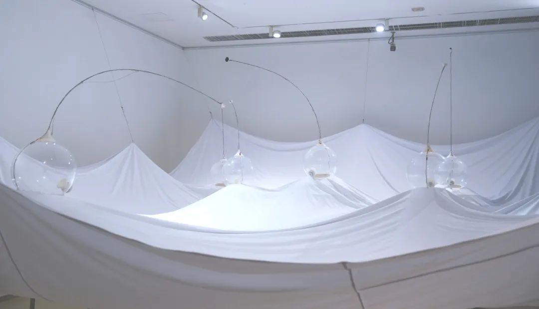 苏永健、巴瑞云 《当呼吸可以言语》 装置,麦克风和扬声器、亚克力罩、白布
