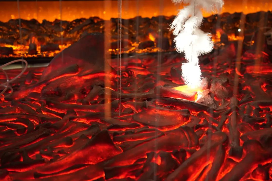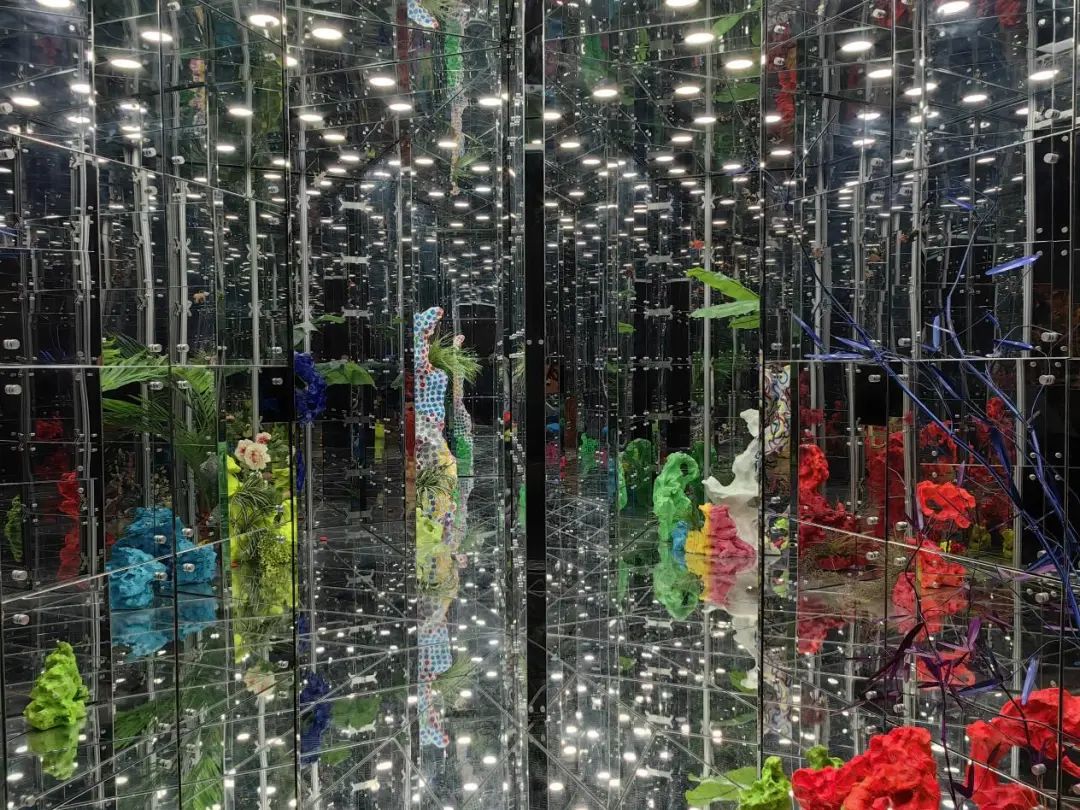 在一楼大厅中央展出的是邓国源的大型装置作品《诺亚花园》,艺术家借用了诺亚方舟故事中救赎与治愈的寓意,精心设计了载有中国古典园林中异化了的五彩缤纷的超现实的、假的梅、兰、竹、菊、太湖石的花园景观元素,利用近千块镜面,不同角度的相互折射、无限延伸的物理空间、真实与虚幻叠加交融所营造的万花筒般的迷离与梦幻的景象。试图以虚拟现实、镜相的假象的表现语言,唤醒人们对景观社会与自然环境的生存状态的重新审视与思考。观众在《诺亚花园》系列作品里面,沉浸在镜中自己的映像中,感觉到真实与虚幻的迷失,本我与他我的身份变换、认知与触觉的对立,现象与本质的距离,表象之美与哲学之美的交替。