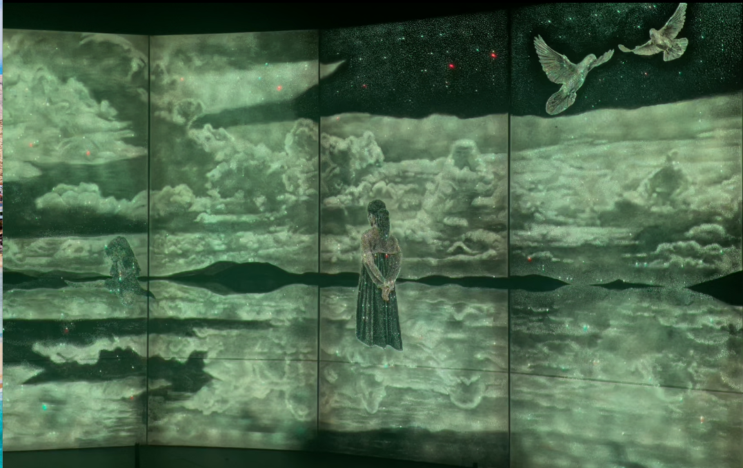 韩镐《永恒的光-同床异梦》将现代光技术与绘画相结合,展现了过去与当下在同一空间中共存的状态。作品中的反复相聚与离别,展现了在历史的分裂现实中,虽然身处同一空间,却无法相见或相聚的被分离的自我。这是艺术家的真实写照——他在34年间未能见到母亲,直到34年后才重聚。这种经历不仅体现了对失去母亲的思念,也象征着一个民族在分裂现实中所面临的离散家庭的情感。