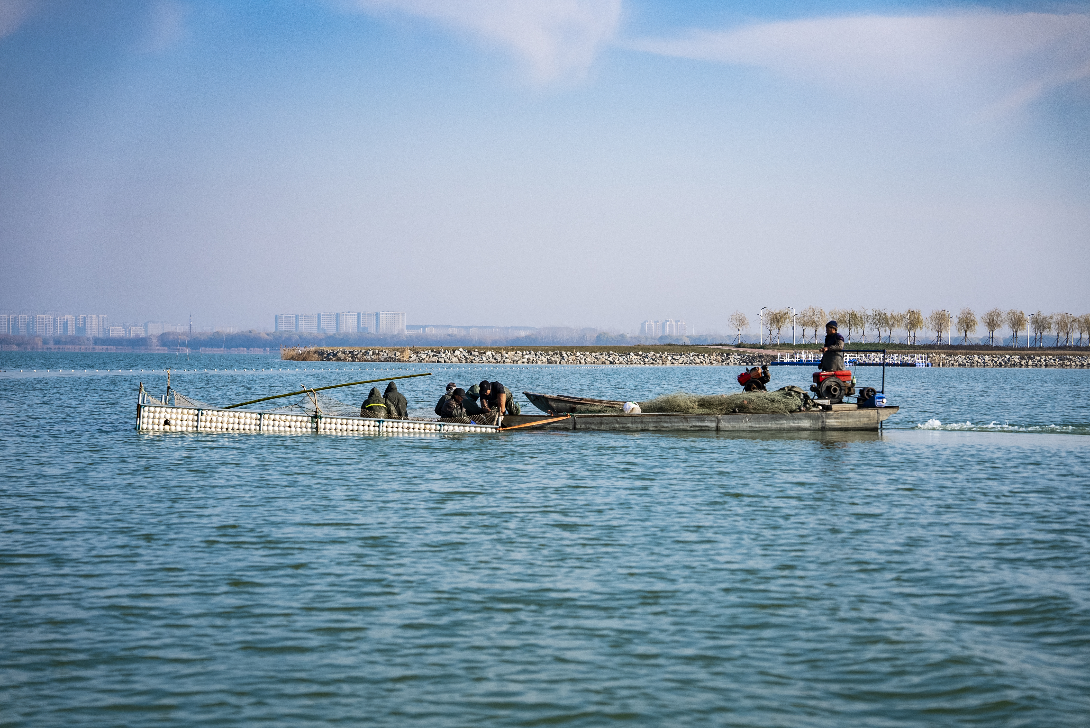 当日上午9时,天高云淡,风平浪静,气温降至零下3℃,正是收网起鱼的好时机。在湖中心的捕捞水域,捕鱼队伍已经开始将鱼再次聚集,5名捕鱼师傅分别站在两条船上,两名师傅站在泡沫和木板制作而成的鱼排内,将提前布好的网箱与鱼排拴牢固定,在吆喝声中不停拉动手中的大网。