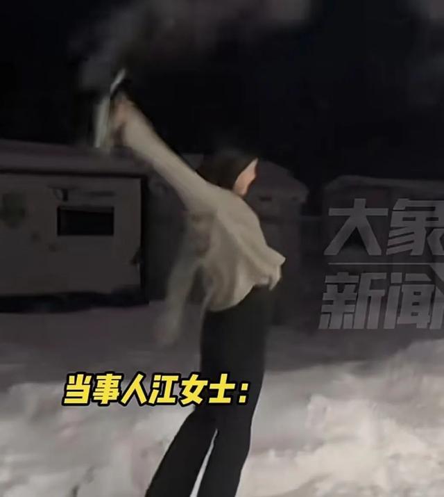 江女士称,之前在网上见过“泼水成冰”的景象,只要在极寒天气中泼出热水,水便会在空中迅速凝结成冰,她决定亲自尝试一下。然而由于她操作失误,热水扬起的弧线不但没有瞬间成冰,还浇在其头部导致烫伤。