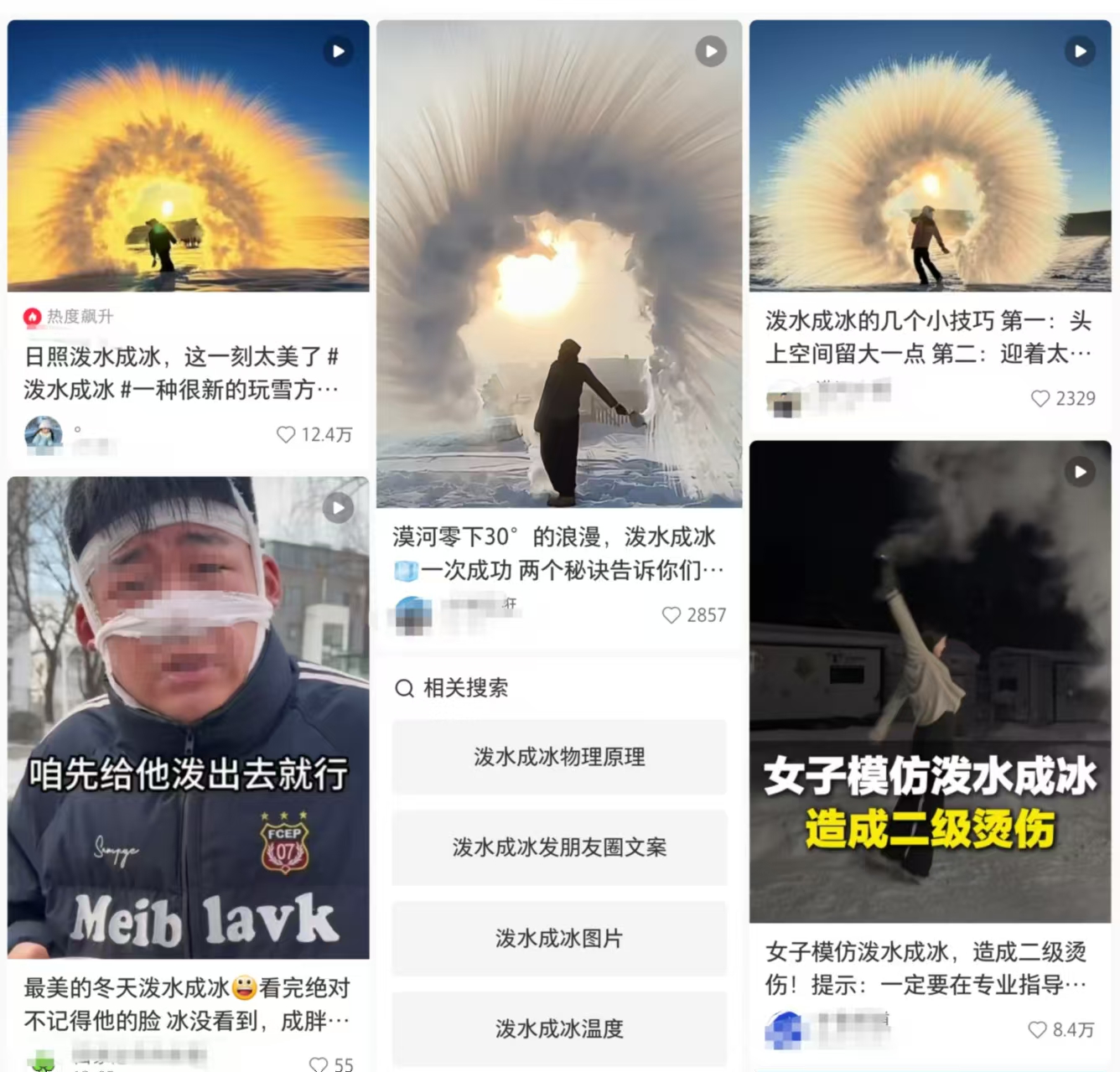 记者注意到,在社交平台搜索“泼水成冰”相关的词条,能看到很多拍摄的照片和视频。