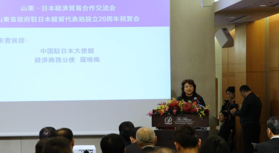 中国驻日本大使馆公使罗晓梅致辞表示,山东是中国重要产业基地,与日本经贸关系密切。山东驻日经贸代表处成立20年来,在促进中日经贸往来、地方友好交流等方面发挥了重要作用,为促进两国经济、文化等各领域合作做出重要贡献,希望今后发挥更大作用,推动山东与日本经贸合作走得更远。