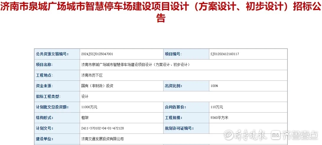 近日,有网友在社交平台发布消息称,济南市泉城广场城市智慧停车场建设项目设计进行公开招标。随后,记者在济南公共资源交易网查询发现,《济南市泉城广场城市智慧停车场建设项目设计(方案设计、初步设计)招标公告》显示,该项目计划批文总投资额为1.1亿元,工程规模约9360平方米,设计周期10日历天。