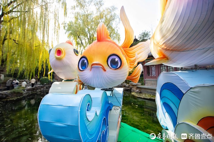 在趵突泉景区泺苑东侧水面处,即将亮相济南第44届趵突泉迎春花灯会的“锦鲤呈祥”灯组,目前已安装完毕。锦鲤花灯线条饱满圆润,两只眼睛闪亮圆润,鱼嘴俏皮地噘起,极具卡通风格。