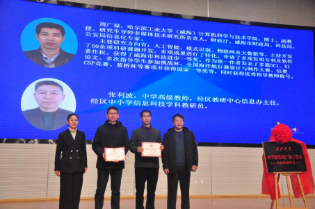 随后,在全体与会人员的见证下,经区教体服务中心龙进峰校长和哈工大周广禄教授共同为五洲中学科学校长工作室(信息科创中心)揭牌,标志着学校在科学教育领域开启了新的征程。