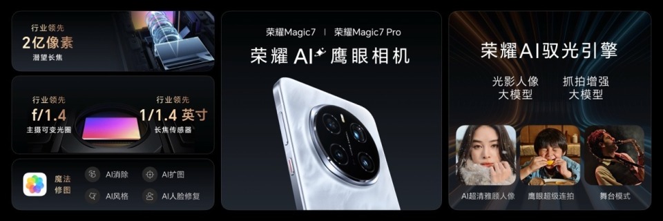 接下来就是,荣耀引以为傲的拍照功能。此次影像系统荣耀Magic7系列后置三摄镜头模组,包括50MP的主摄像头、50MP的超广角摄像头和12MP的人像镜头,采用荣耀自研的算法,拍摄效果细腻。主摄的F1.4-F2.0可变光圈在不同光照条件下提供出色的感光性能,确保照片的亮度和清晰度。Pro版本搭载2亿像素的潜望式长焦镜头,拍摄远景时能够捕捉更多细节,夜景拍摄效果也非常优秀。