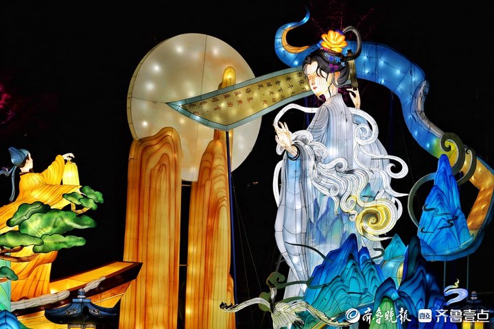 据悉,“千百度”花灯组长15m、高6m,整体呈现的场景为:一艘小船浮于水面,“辛弃疾”手提花灯,神情专注,对面青山绿水画卷徐徐展开,温文尔雅的女子静立其中,灯光映照出“辛弃疾”寻觅的目光;灯组画面浪漫而富有诗意,将 “众里寻他千百度,蓦然回首,那人却在,灯火阑珊处” 的意境具象化,让观赏者感受那穿越山水终得相遇的美好与惊喜。