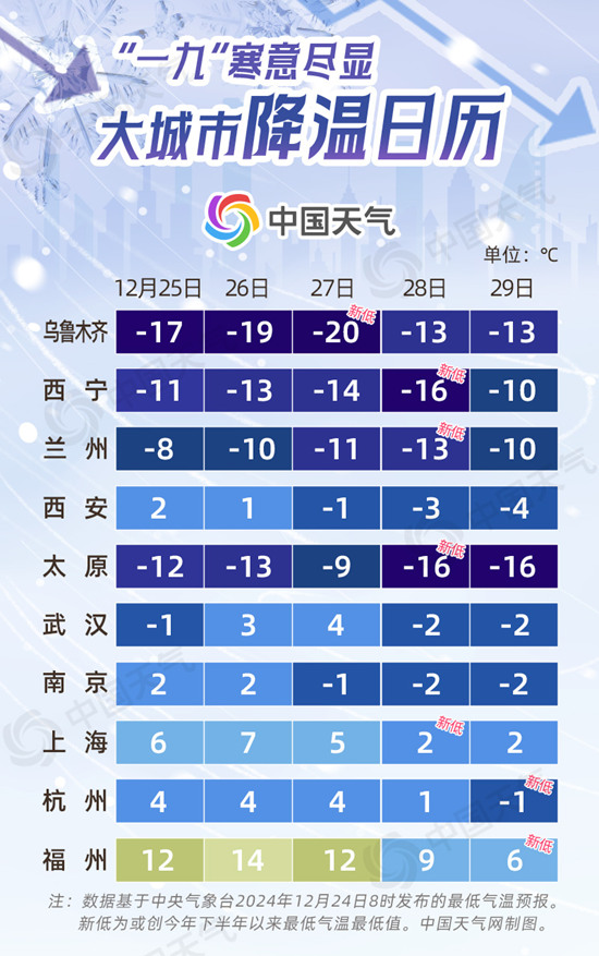 数九寒天,我国大部进入隆冬时节。都说“一九”“二九”不出手,今年“一九”我国大部也是在寒冷中开场。明天(12月25日)至27日,又将有较强冷空气影响我国,“一九”寒意尽显。中国天气网推出大城市降温日历,看哪些城市将创今年下半年来气温新低。