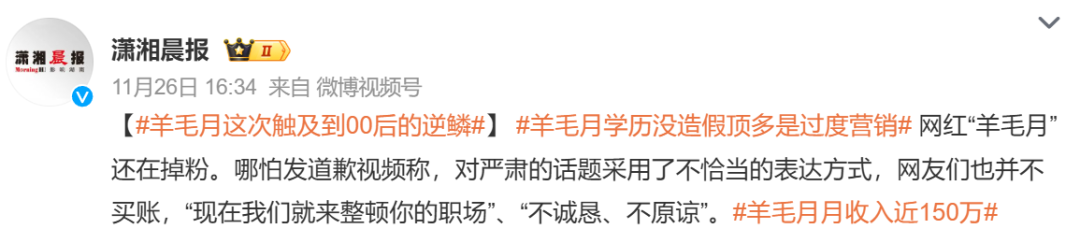 11月23日晚,“羊毛月”发布一条道歉视频,随后,相关话题冲上热搜。