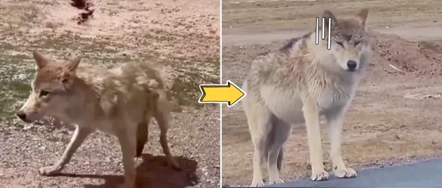 不过,这匹野狼因为不断被人投喂,最初毛发凌乱、瘦到皮包骨头,现在不但体型变得滚圆,还会向过往车辆撒娇讨食。