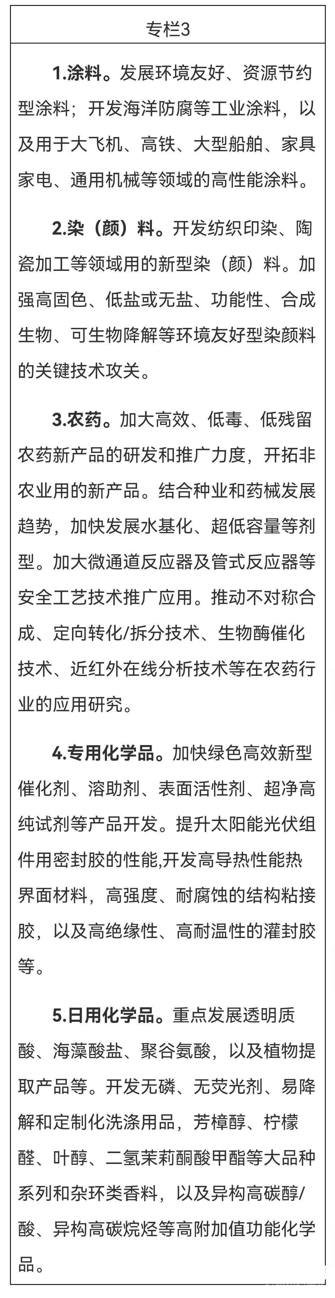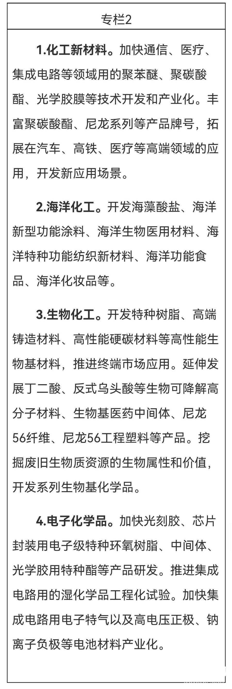 突破一批化工“卡脖子”技术,即紧跟化工新材料、海洋化工、生物化工、电子化学品等新兴化工领域的发展趋势,聚焦国家重大战略、行业发展和民生领域等需求,引导精细化工企业与下游应用企业结对攻关,超前布局前沿技术,进一步积蓄竞争优势。