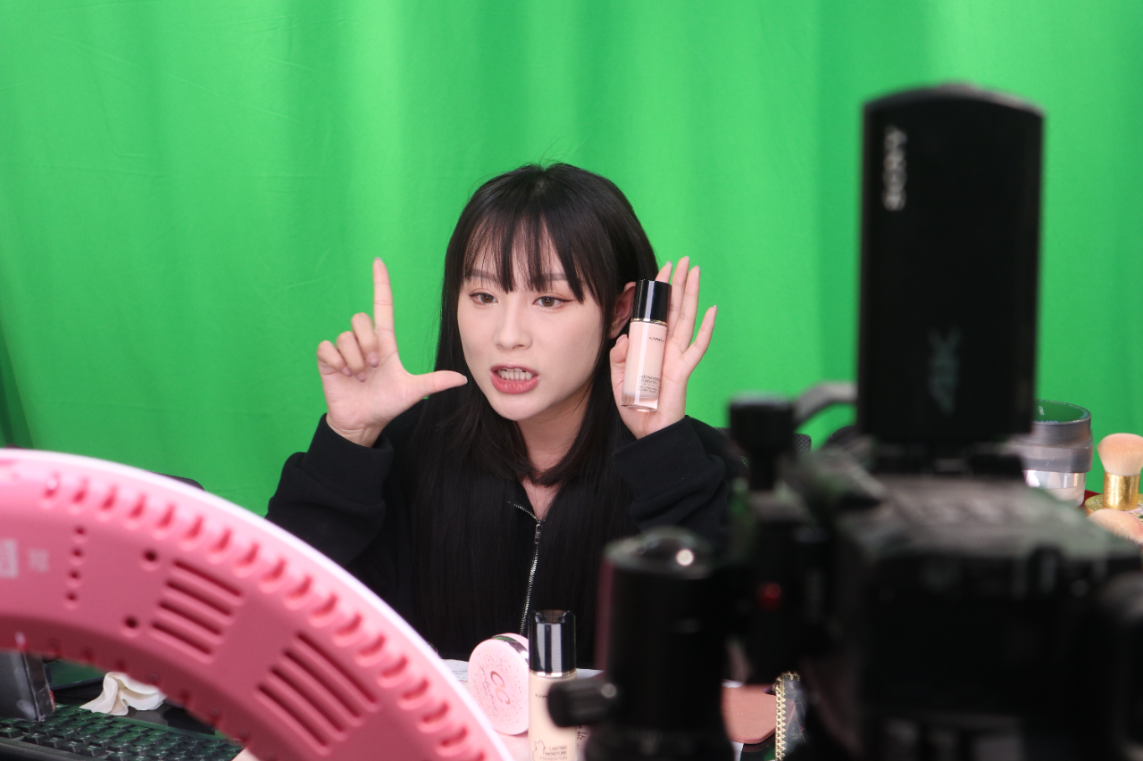 中国一彩妆品牌的主播正在直播卖货。(图片由CNSPHOTO提供)